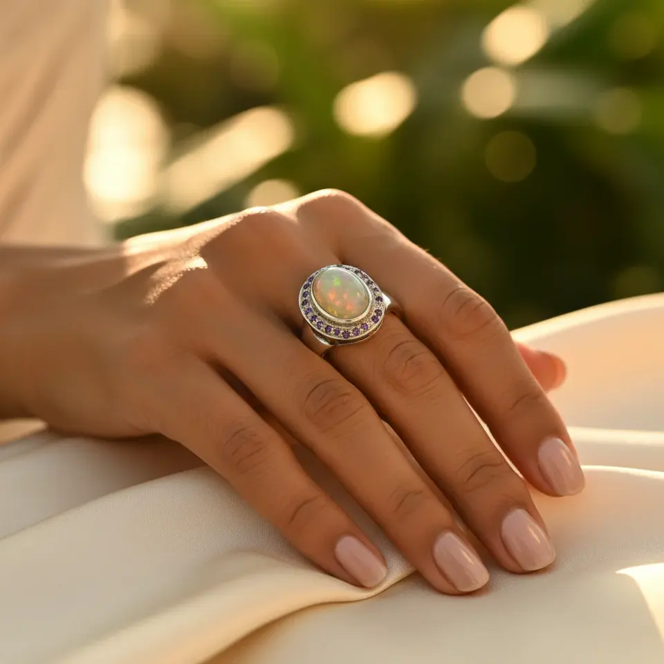 Women's Vintage Opal & Amethyst Ring with Oval Cut Diamond 925 Silver Rhodium Plated Fine Jewelry with Setting Inlay