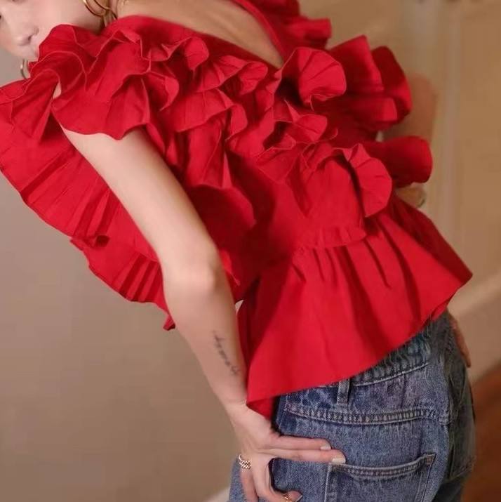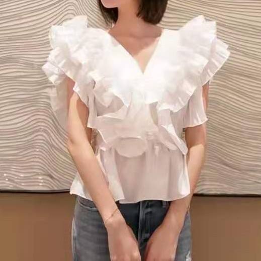 Chemise pour femme à col en V qui définit la taille, avec volants plissés et haut sans manches, tendance