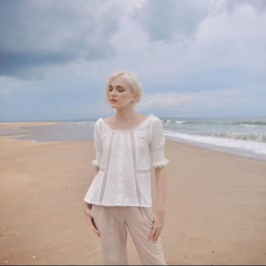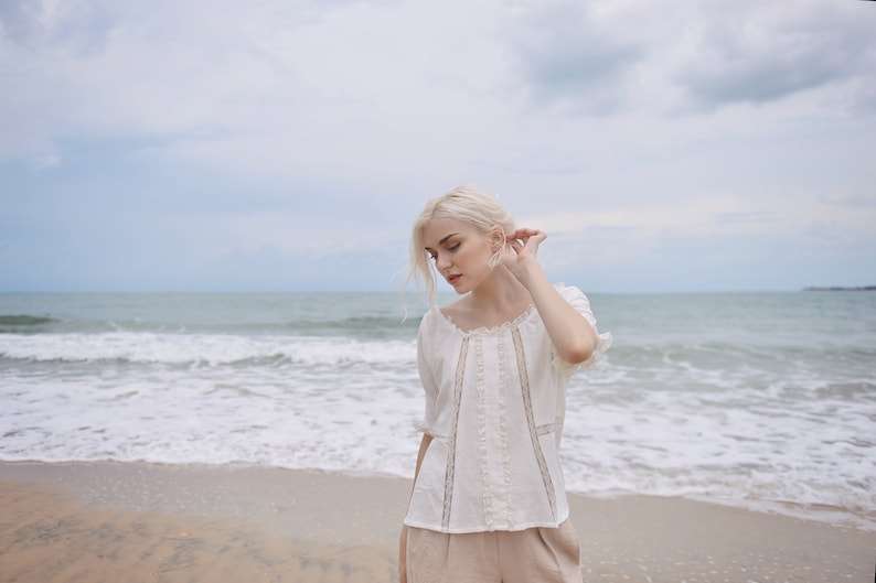 Women's White Linen Top Loose Fit Summer Cotton Blouse Lightweight Breathable Shirt for Daily Casual Wear with Natural Waistline