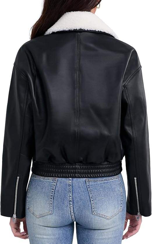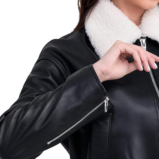 Blouson aviateur court d'hiver pour femme en cuir d'agneau respirant avec col Sherpa motif solide fermeture éclair sur le devant
