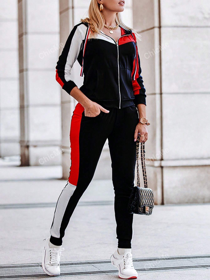 Ensemble de survêtement sportif pour femme, sweat-shirt à capuche zippé décontracté à blocs de couleur tendance pour l'hiver, pantalon de survêtement, 100% coton léger