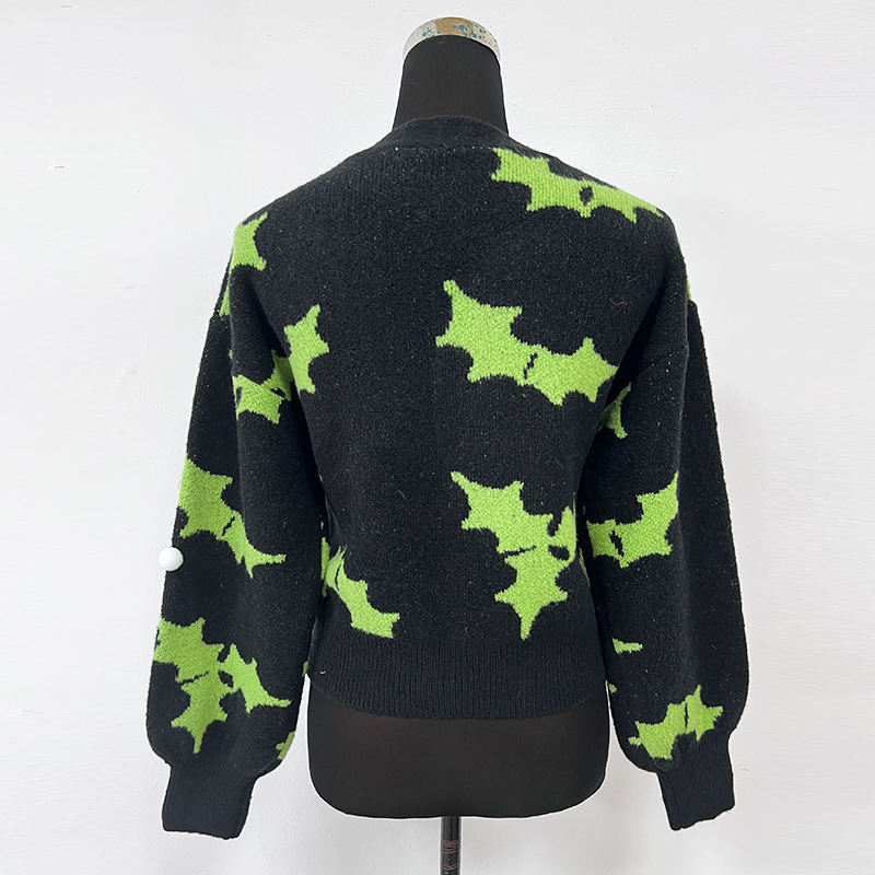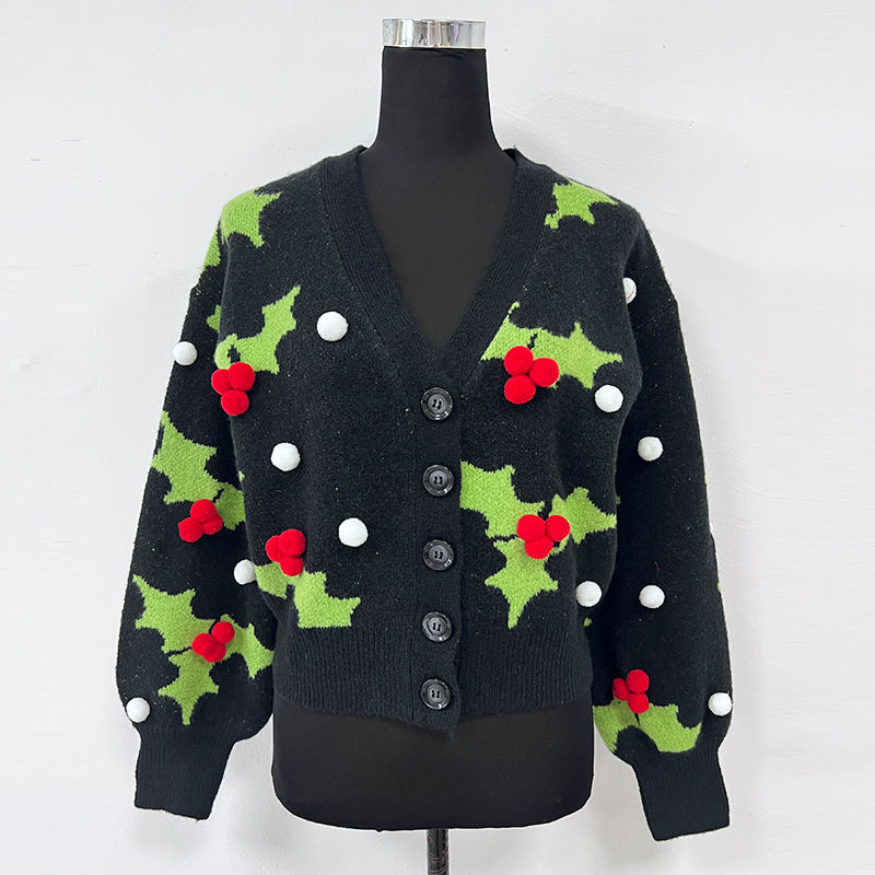 Women's Winter Jacquard Pompom Sweater Long-Sleeved V-Neck Cardigan Single Breasted Loose Fit Coloured Design for Christmas