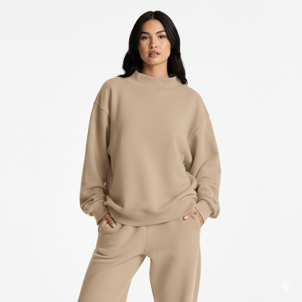 Women's Winter Long Knitted Fleece Oversized Mockneck Sweatshirt Casual Loose Pullover Streetwear Eco-Friendly Top Front Logo