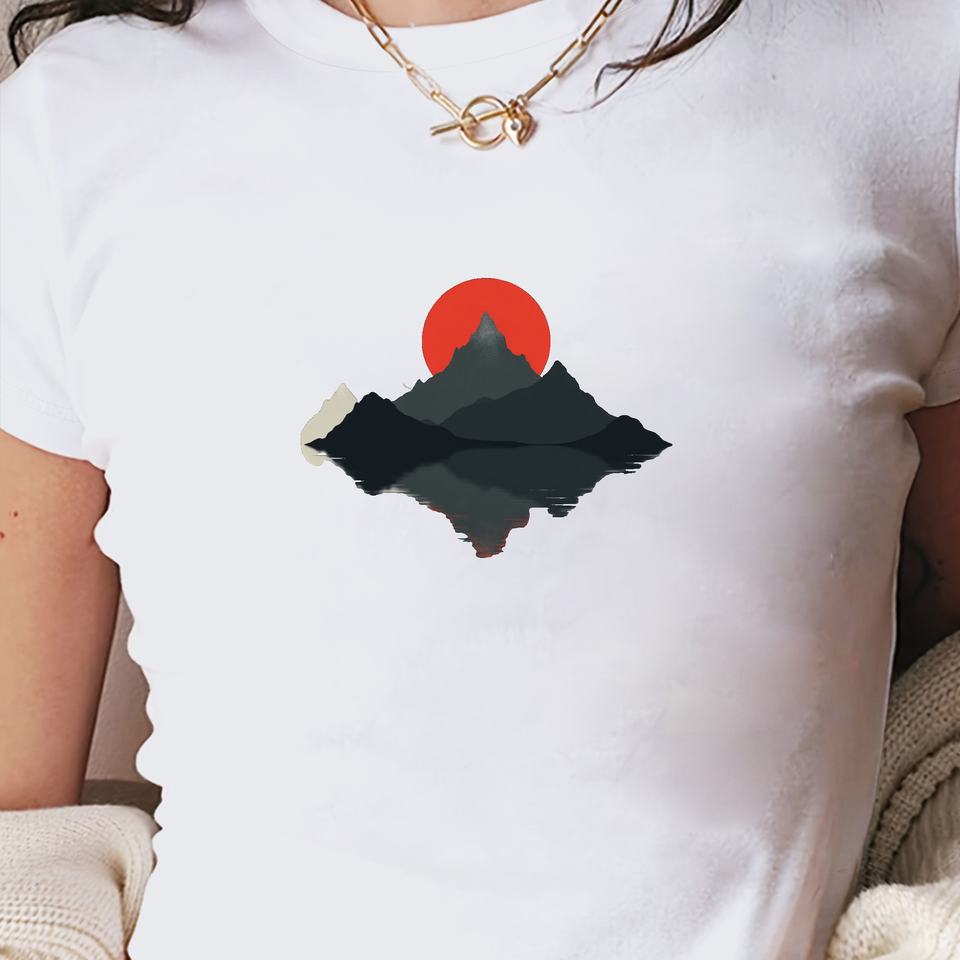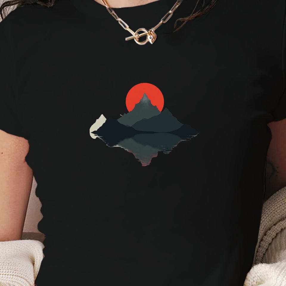 Women's Y2K Style Slim Fit Short T-Shirt Mountain with Red Sun Reflection Print on Knitted Fabric