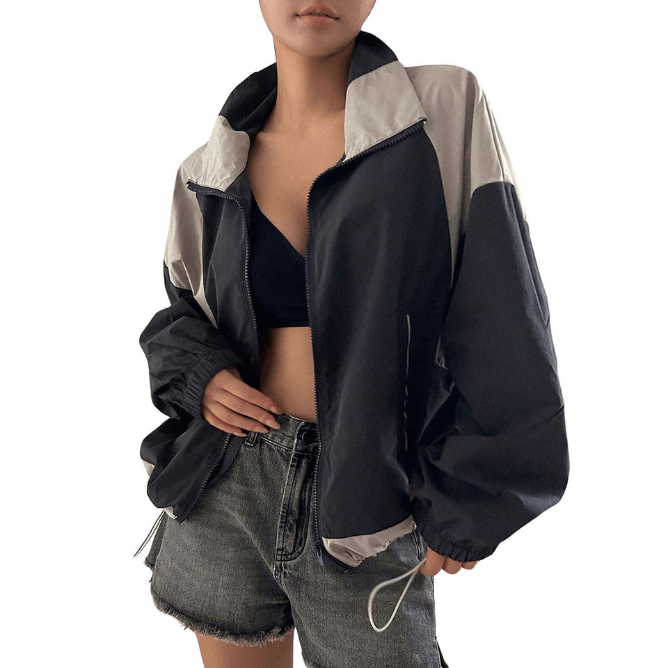 Veste coupe-vent à manches longues pour femme avec fermeture éclair, blocs de couleur, poche zippée, en nylon imperméable