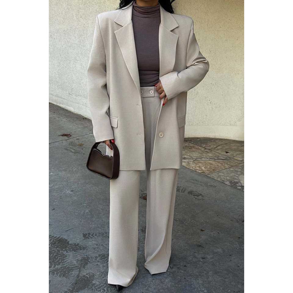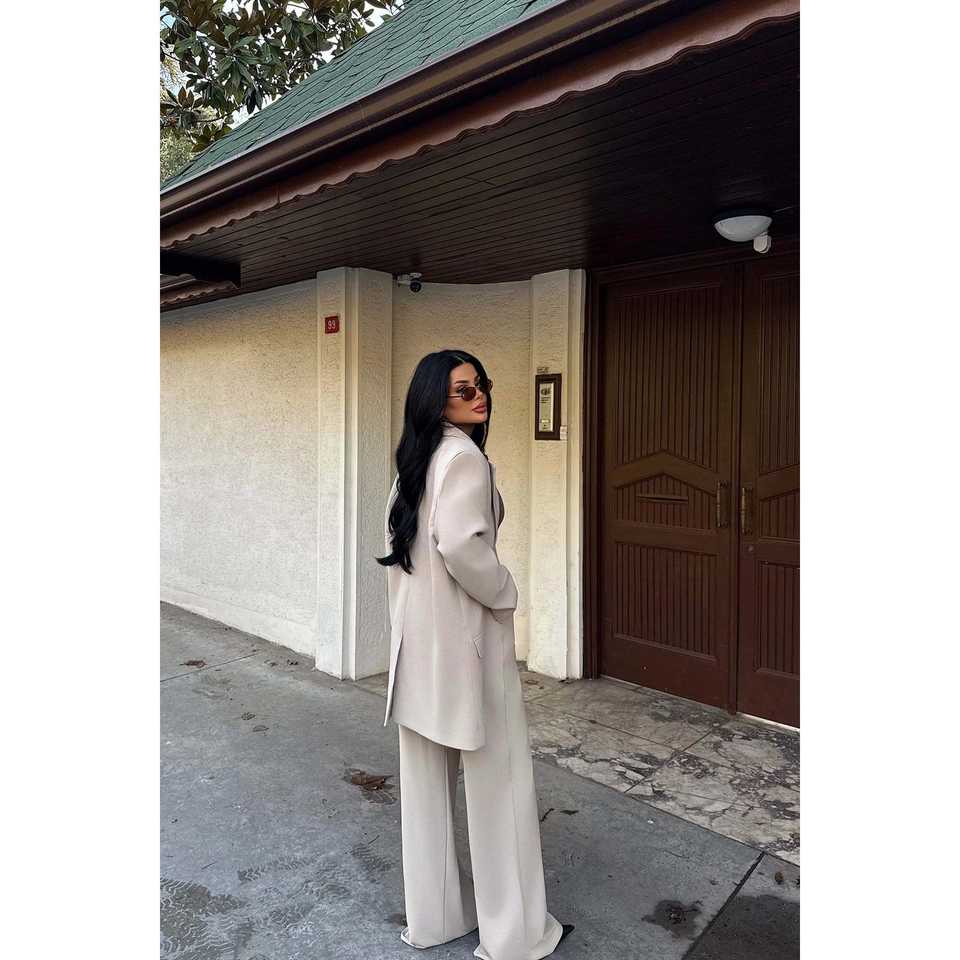 Ensemble de pantalon et veste pour femme avec détails boutonnés couleur crème