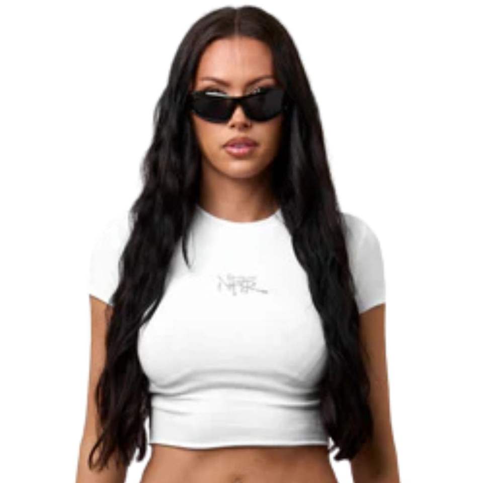 Débardeur court pour femme, blanc, extensible, léger, sans manches, style streetwear, logo minimal, style athlétique