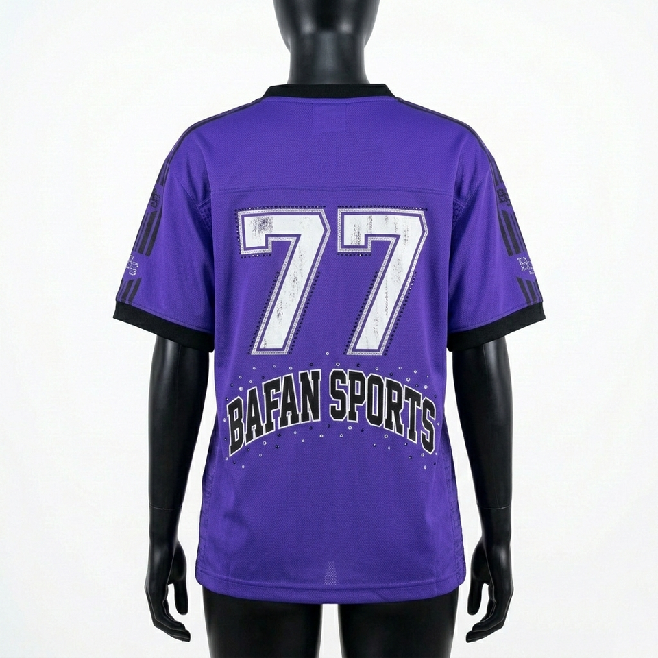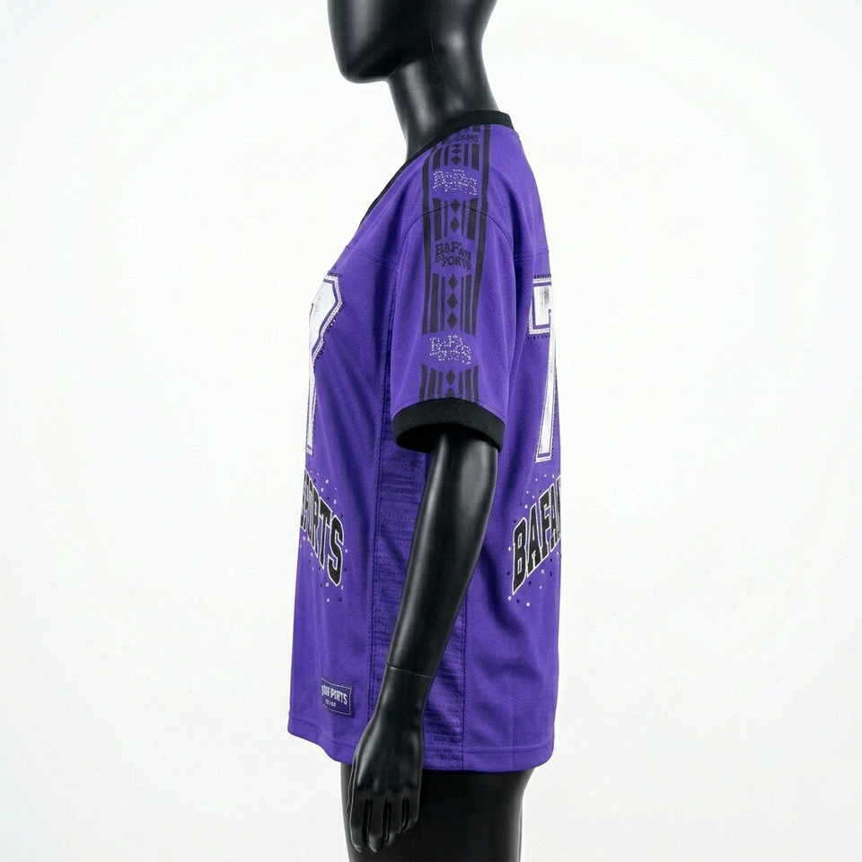Maillot de football pour femmes en micro-mesh polyester, violet, noir, blanc, avec empiècements latéraux, logo personnalisé en twill, maillot de football pour femmes