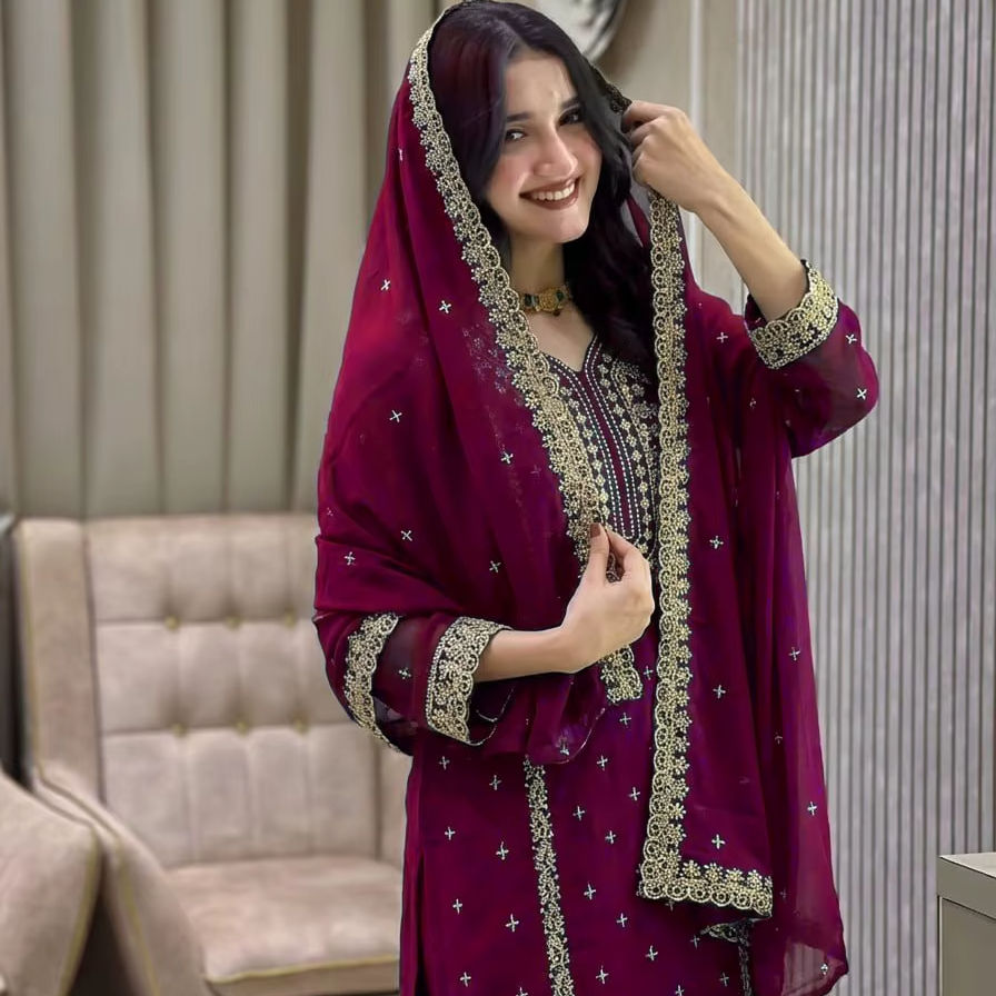 Ensemble haut, bas et dupatta en faux georgette lourd pour femmes, pour les fonctions de mariage, les célébrations et les événements spéciaux, disponible à la vente