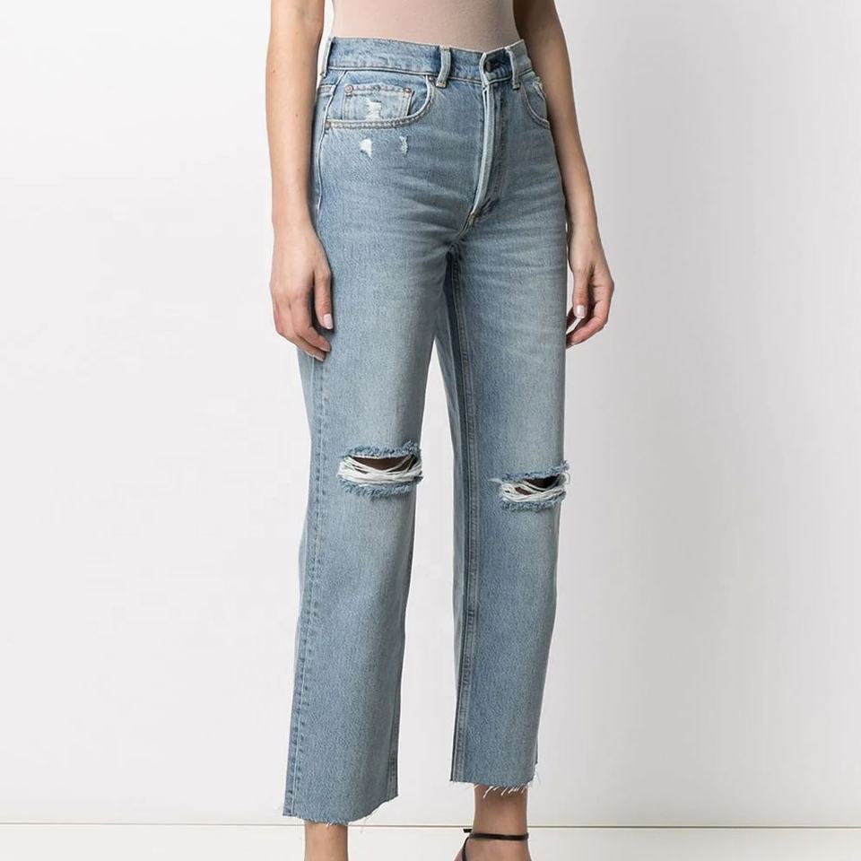 Jean droit taille haute pour femme, style vintage, coupe ample, en denim de coton, avec déchirures aux genoux