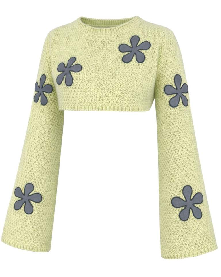 Womens Light Green Cropped Knit Sweater With Flower Applique Long Flare Sleeves Soft Fashion Casual Winter Top Streetwear Styles