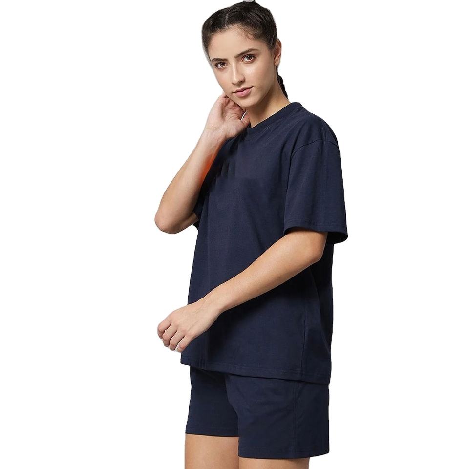 Ensemble deux pièces décontracté bleu marine pour femme : T-shirt oversize imprimé et short – Idéal pour le sport ou la détente