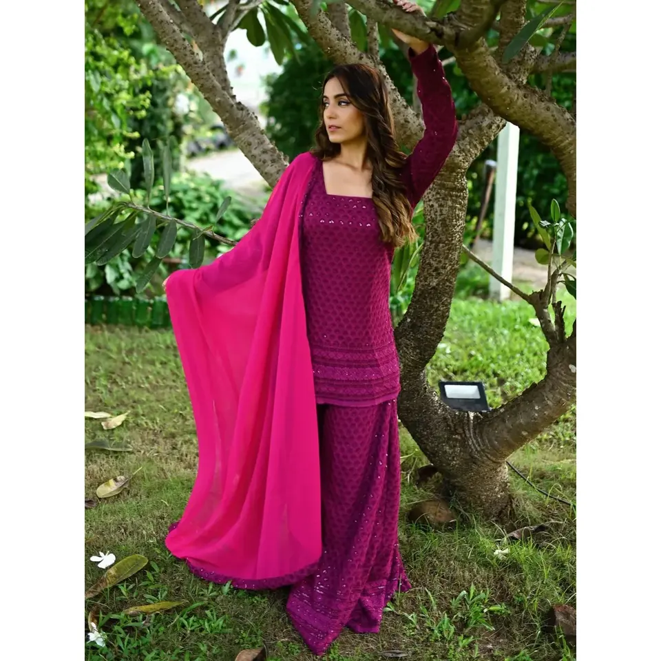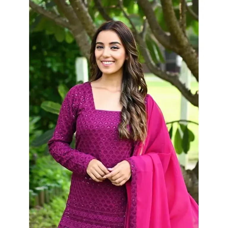 Ensemble de costume Chikankari en vin solide pour femmes, élégant ensemble Kurta pantalon Dupatta brodé, tenue ethnique traditionnelle, un ensemble