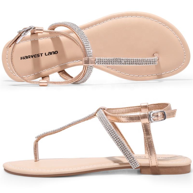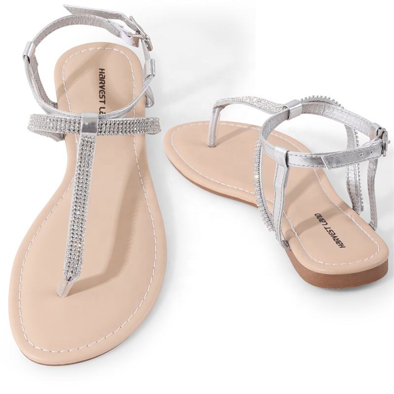 Sandales Plates Femme avec Strass et Bride Cheville, Tongs Décontractées T-Strap pour Dames, Chaussures d'Été Habillées