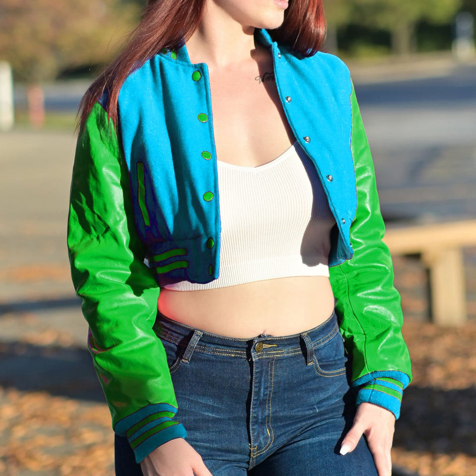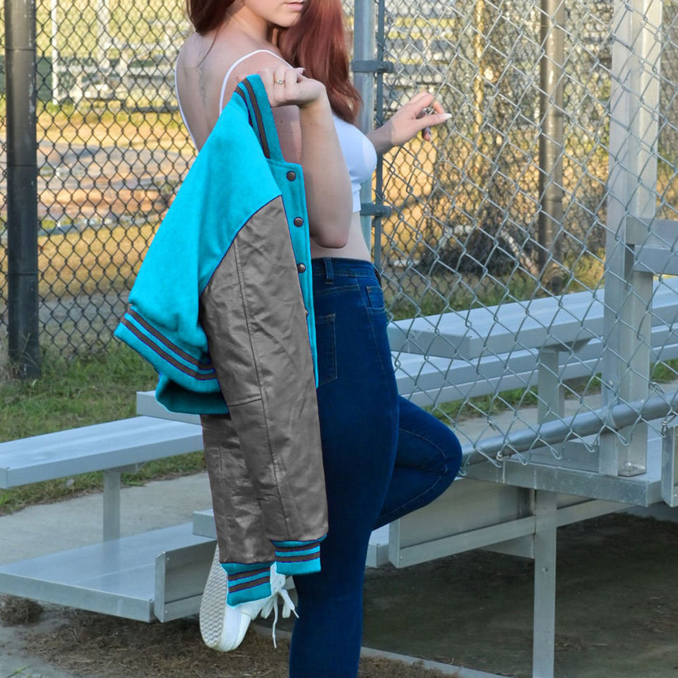 Veste courte universitaire pour femme, style Letterman, gris turquoise, avec manches en similicuir, vêtement d'extérieur décontracté, mode féminine