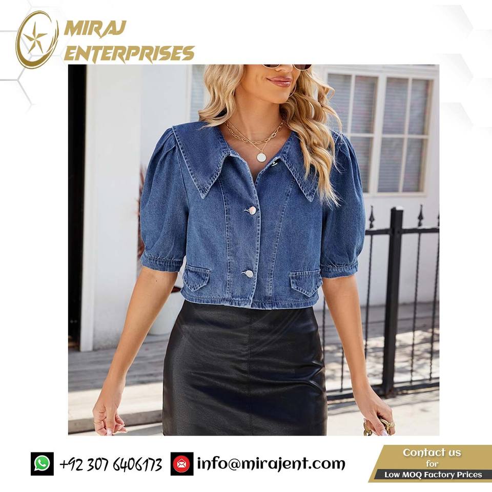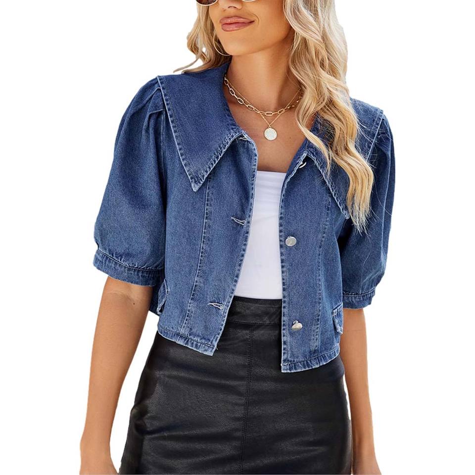 Veste en jean recadrée respirante pour femme extensible 34 manches bouffantes Design universitaire en détresse Shacket perle coton avec poches