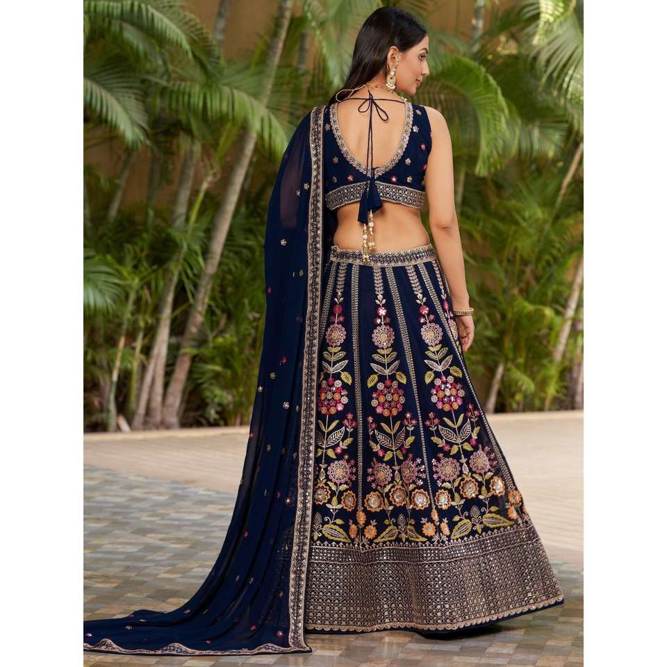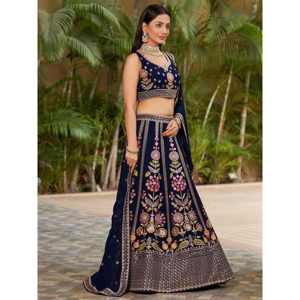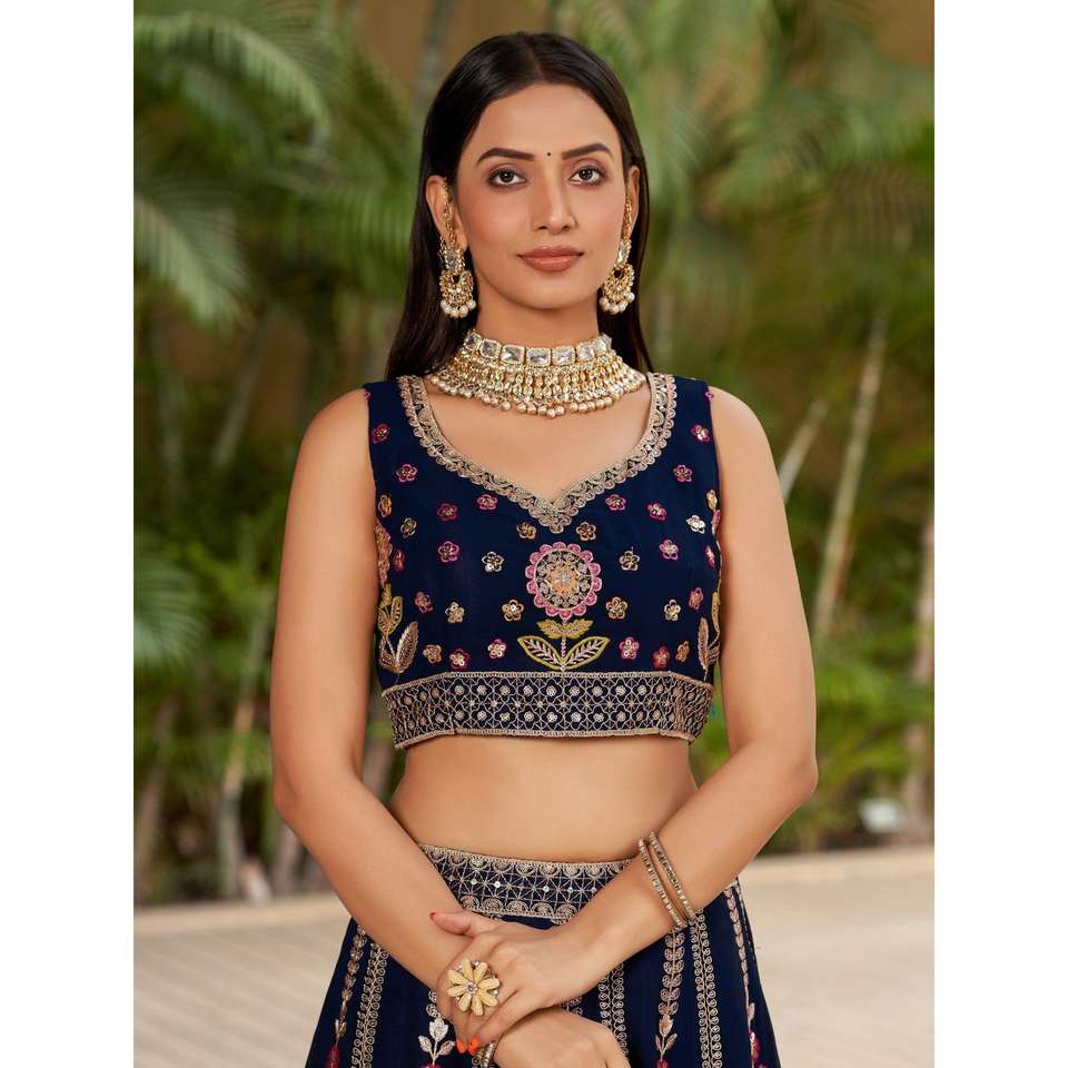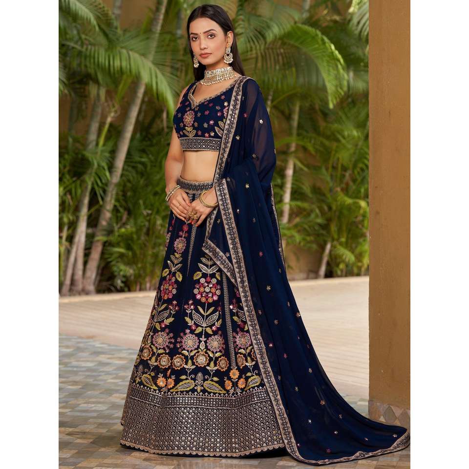 Magnifique Georgette brodée multi-fils bleu marine Lehenga Choli