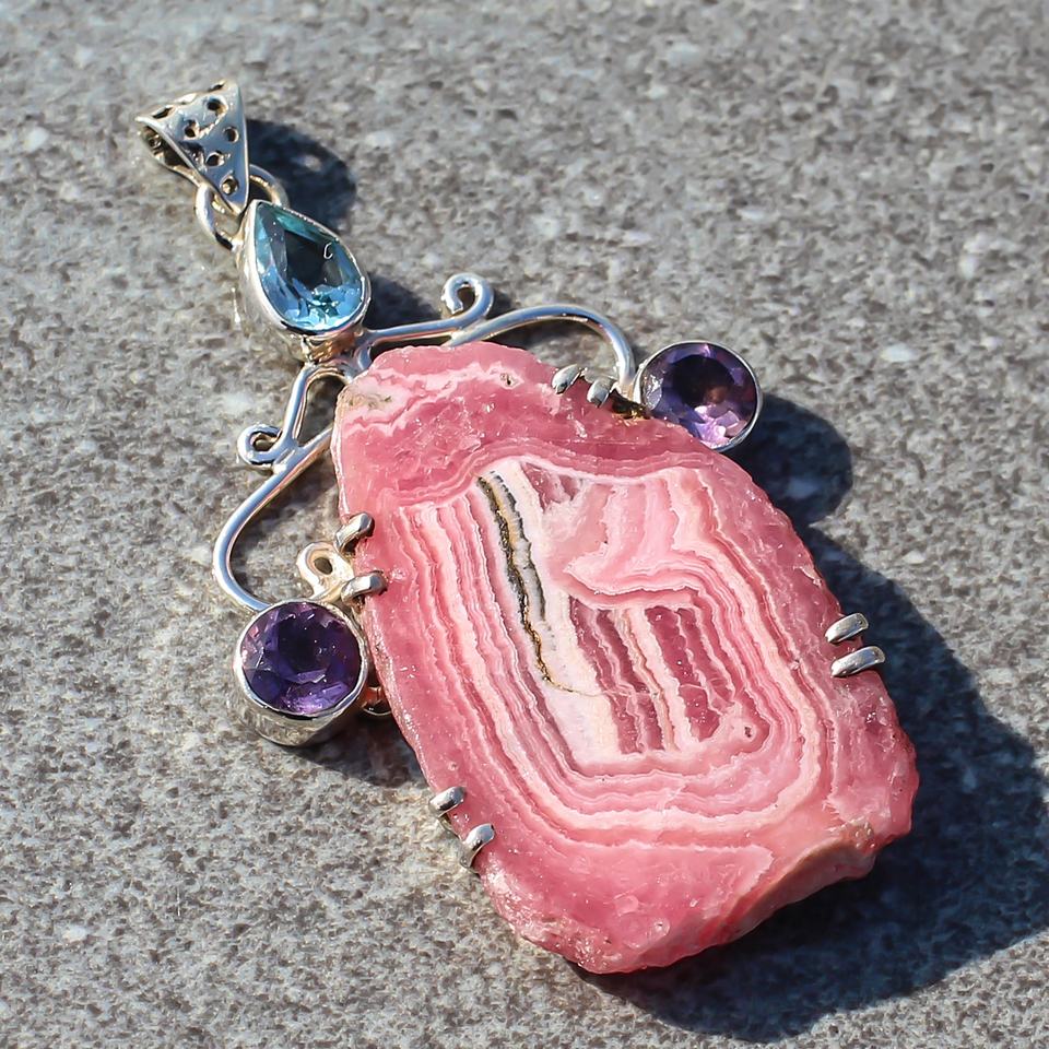 Rhodochrosite & Amethyst Gemstone Pendant Silver Handmade Jewelry