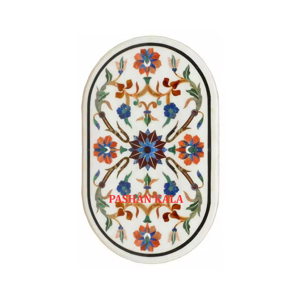 Merveilleuse forme ovale en marbre blanc de conception royale classique avec le dessus de table d'incrustation de marbre précieux naturel pour le meilleur prix bas