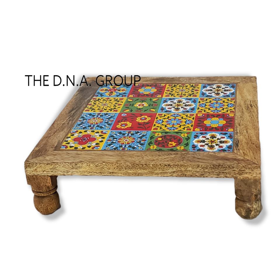 Handcrafted Wood and Ceramic Tiles Bajot Chowki Art Deco Design Christmas Decor Set of 3 for Multi-Purpose Use