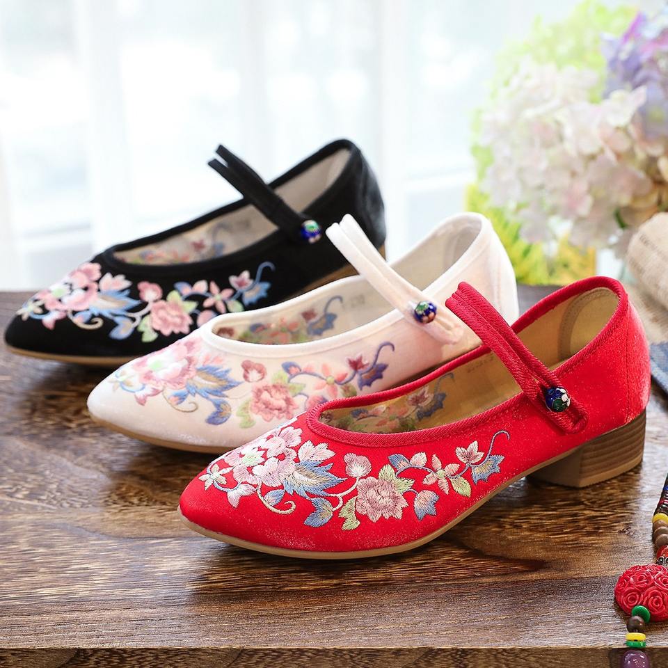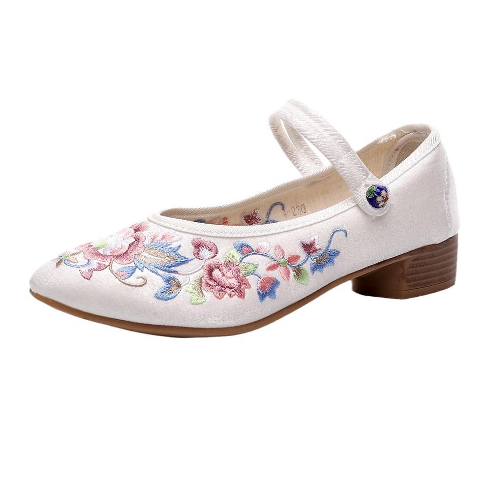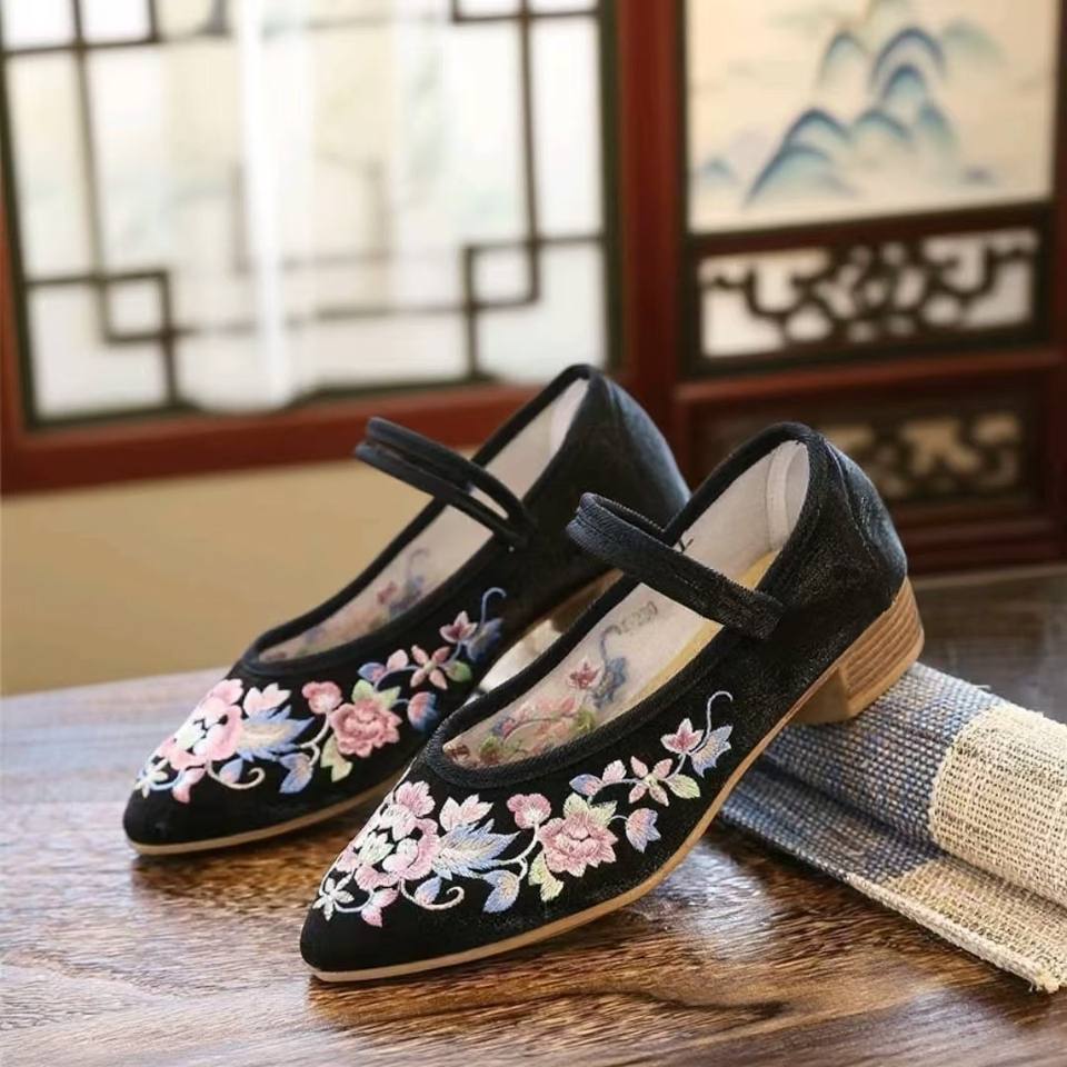 Mules à bout pointu pour femme, en tissu brodé, à talon carré épais, semelle extérieure TPR effet bois, printemps/automne