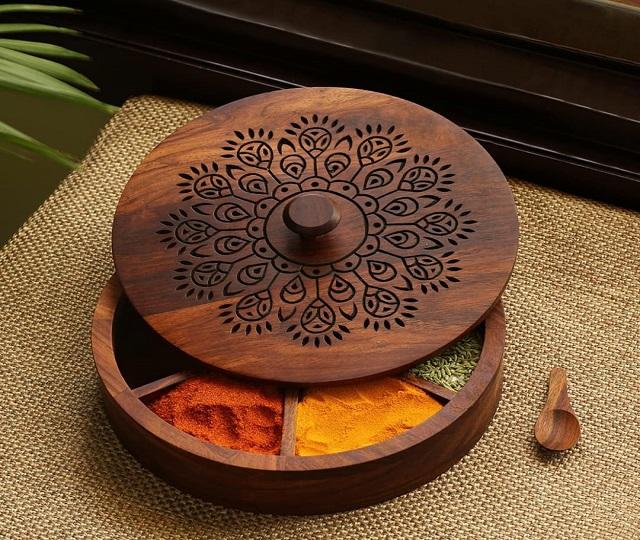 Boîte de stockage en bois Masala Spices Dabba Box pour taille personnalisée et forme ronde à bas prix pour 6 boîtes Design supérieur