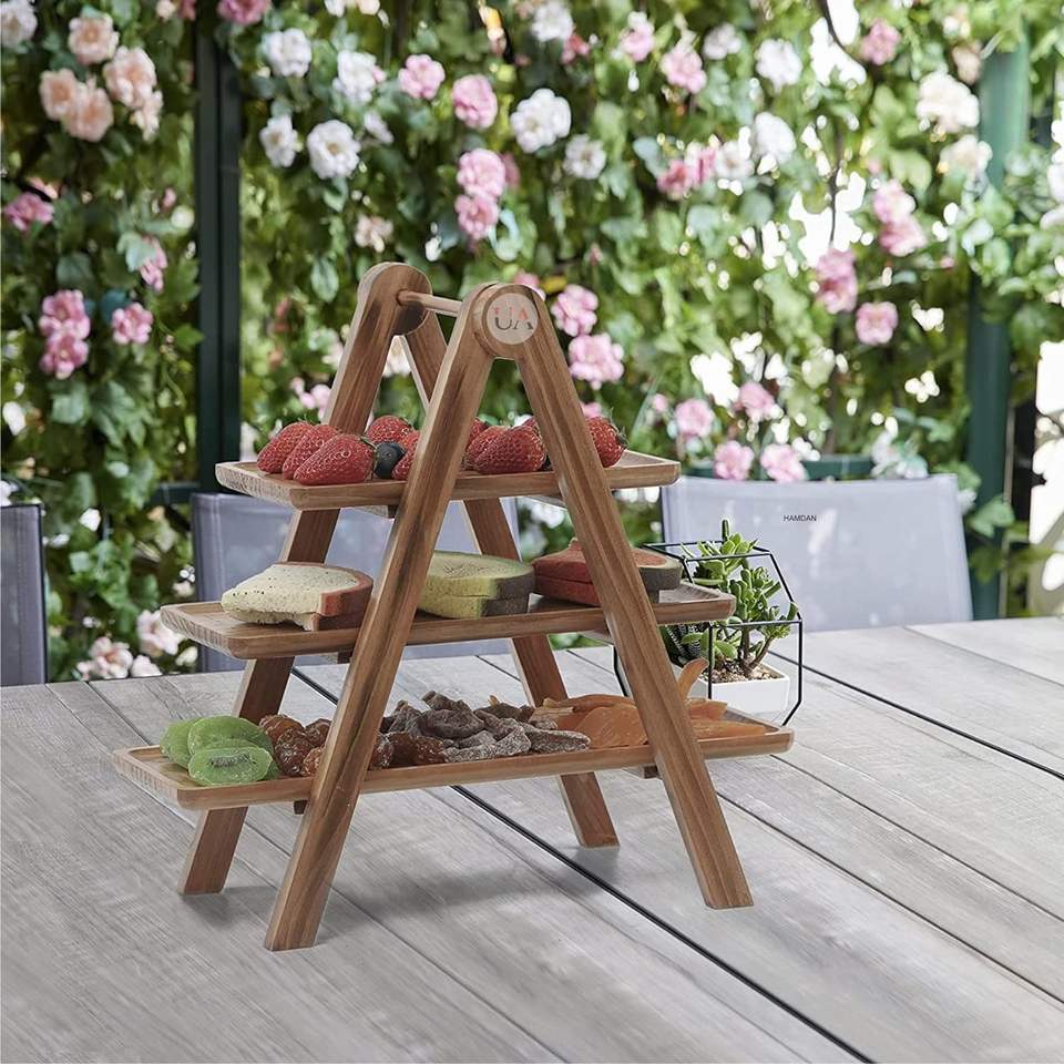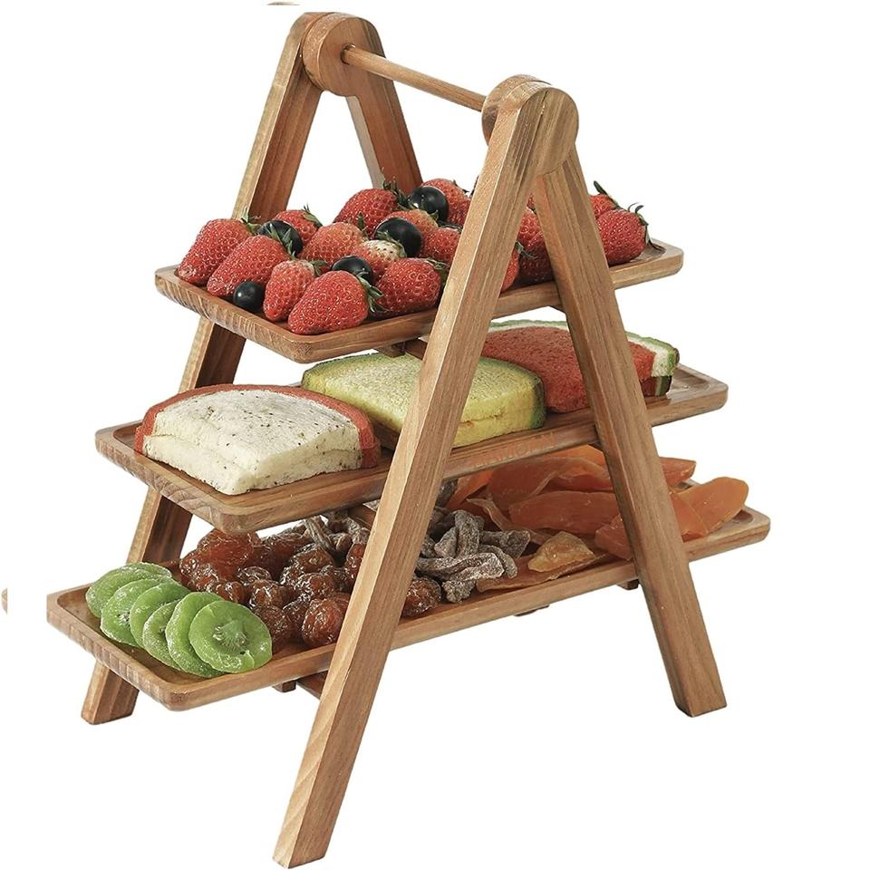 Plateau de service en bois à trois niveaux support pliable pour plateau de fruits ferme, cuisine, pique-nique plateau de nidification naturel
