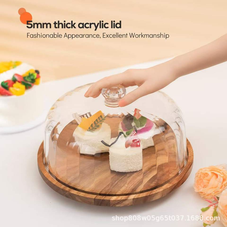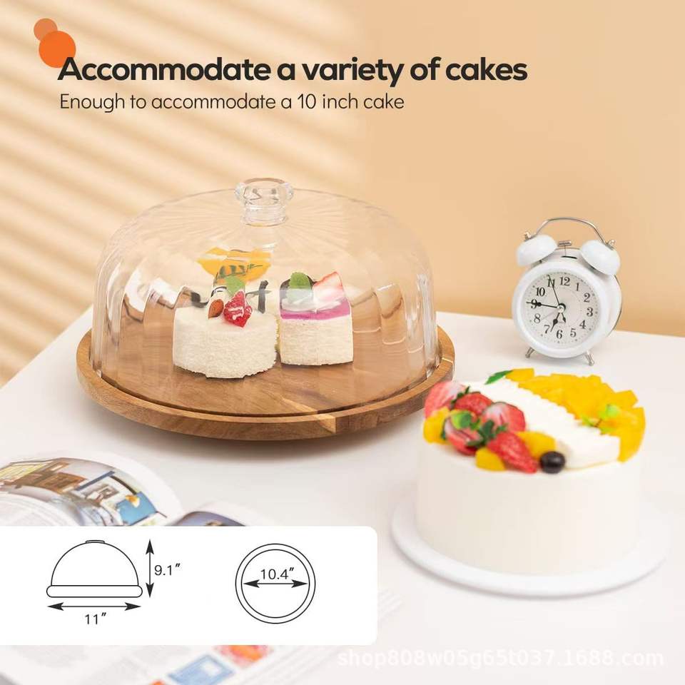 Plateau à gâteau en bois avec base rotative, plateau à dessert rond en bois massif avec couvercle transparent pour les fêtes d'anniversaire