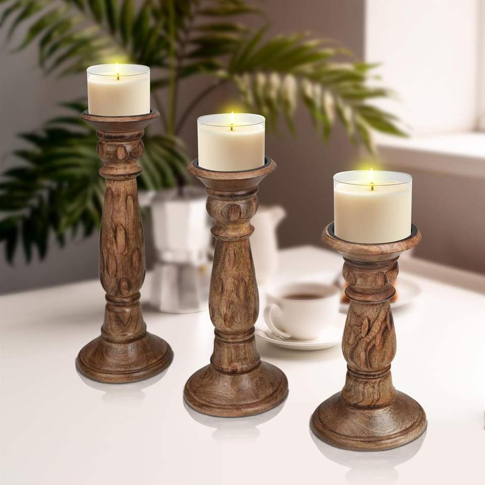 Wooden Candle Holder Set of 3, Hand-Carved Mango Wood with Elegant Design, Vintage Unique Carving Home Decor Pillar & Tea Light