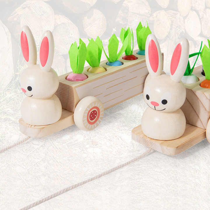 Dessin animé en bois lapin tirer radis jeu jouet pousser le long chariot enfants éducation précoce couleur taille trieur correspondant jeu jouets ensemble