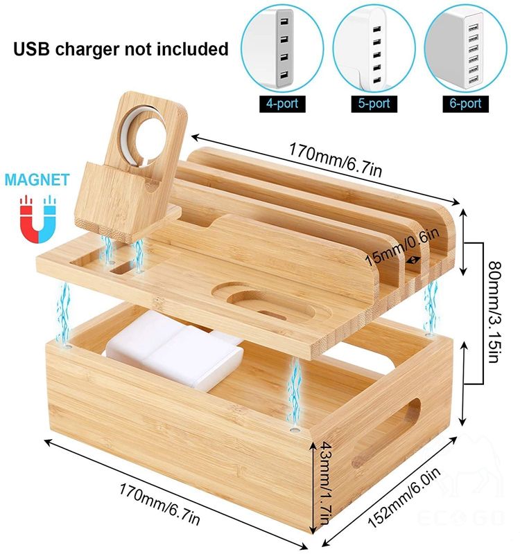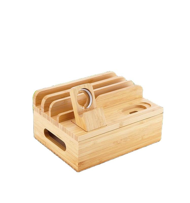 Station de charge en bambou Organisateur de bureau pour téléphone portable en bois