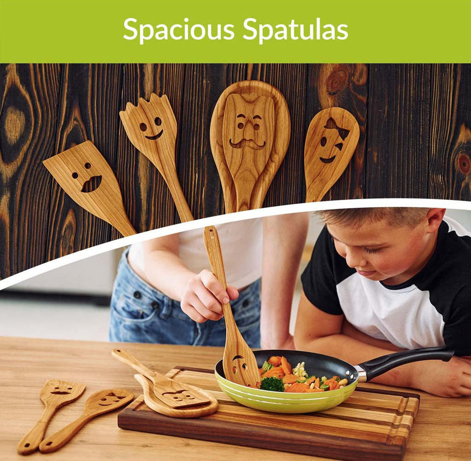Cuillères de cuisine en bois, ensemble de 5 spatules de cuisine, cuillères en bois pour cuisiner, ensemble d'ustensiles amusants avec des visages souriants, ustensiles en bois