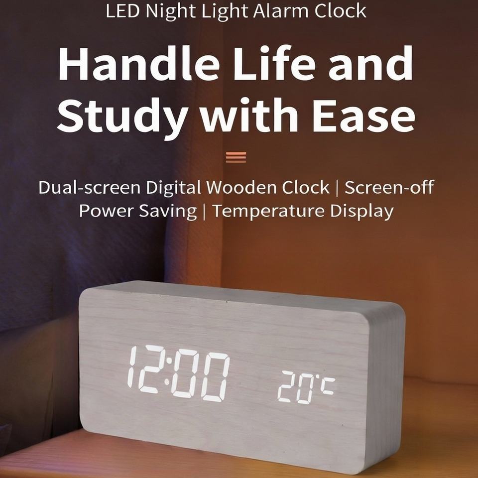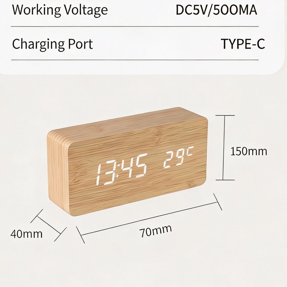 Horloge de table numérique en bois avec affichage LED, surveillance de la température et de l'humidité, commande vocale, alarme, calendriers/date, fonctionne sur piles