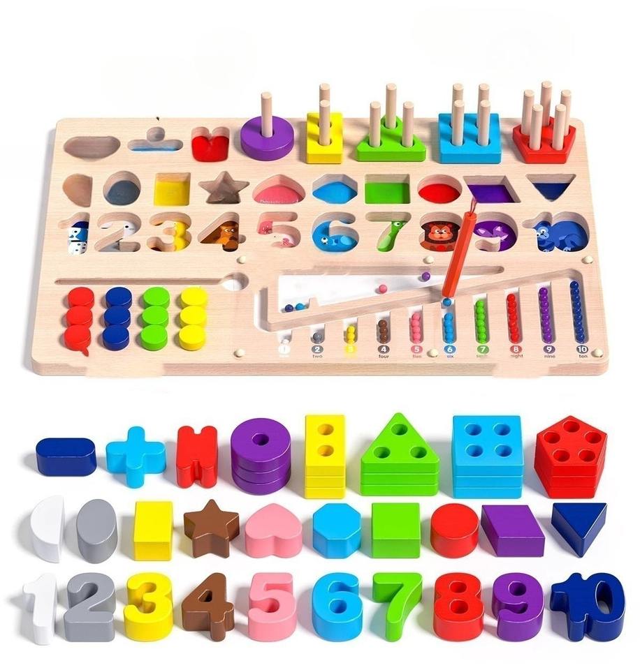 Planche d'apprentissage éducative en bois pour enfants avec des nombres, des formes, des couleurs, un abaque et des jouets de puzzle de style Montessori