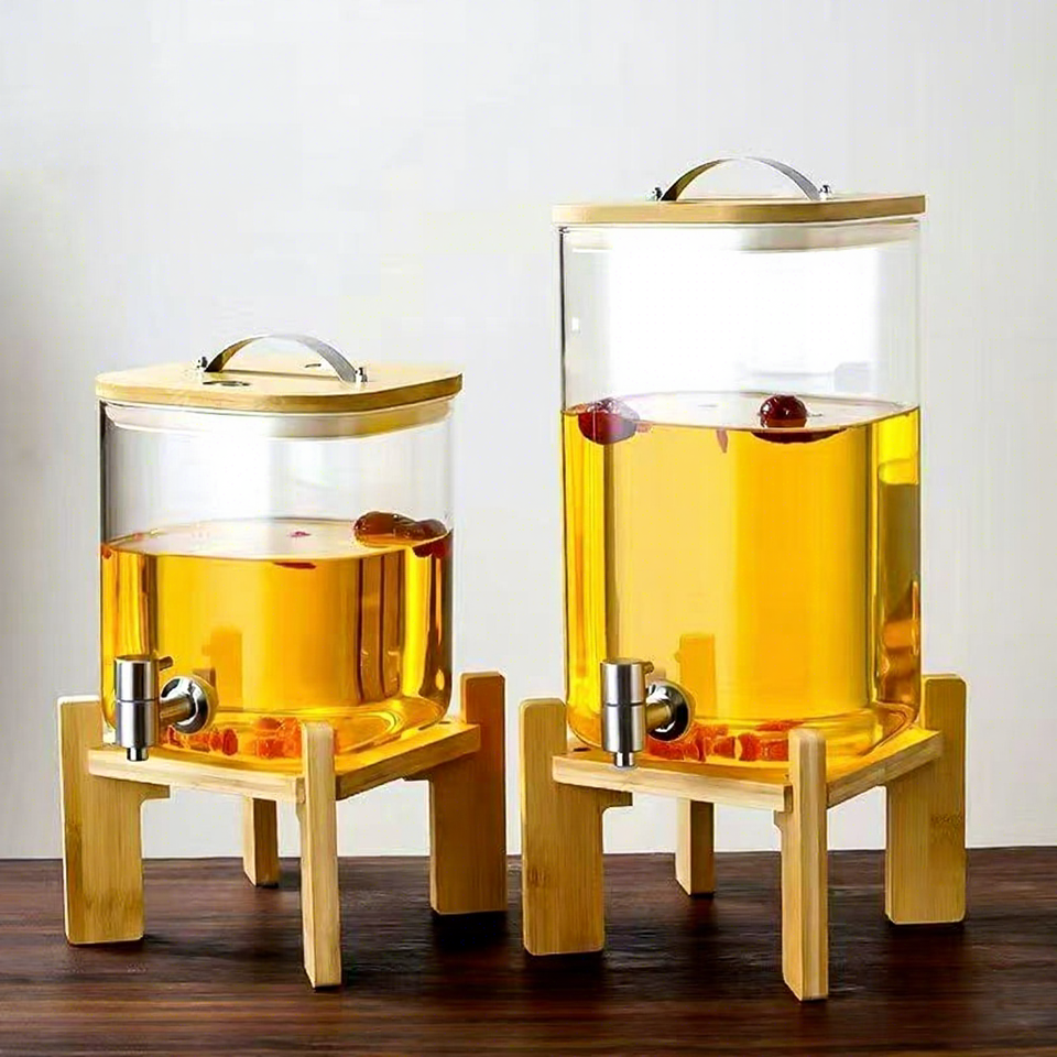 Carafe en verre à grande capacité (5/8/10L) avec cadre en bois, écologique, résistante à la chaleur, avec robinet et couvercle interchangeables, idéale pour les fêtes
