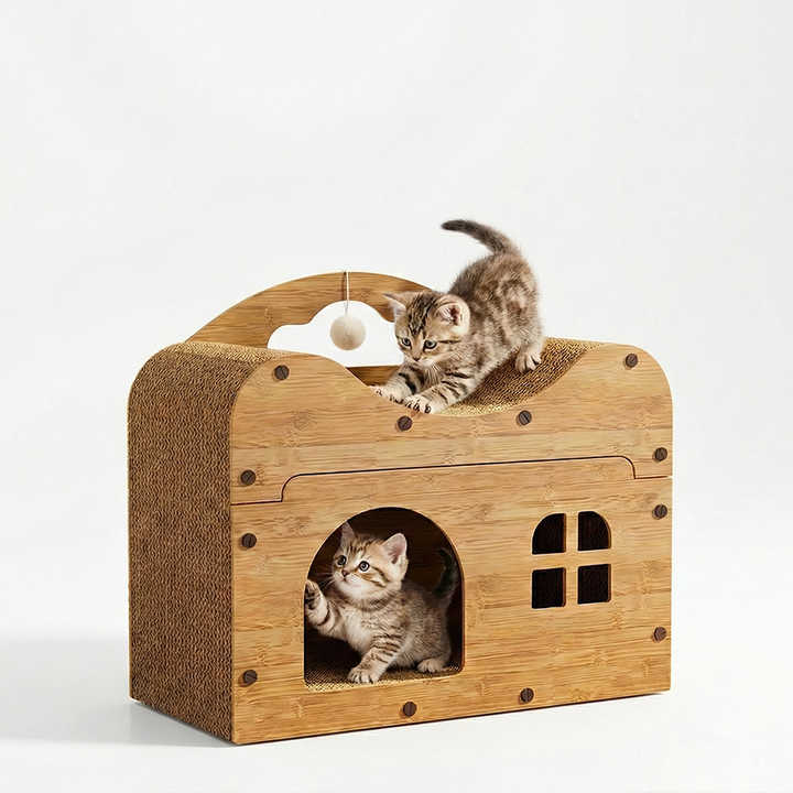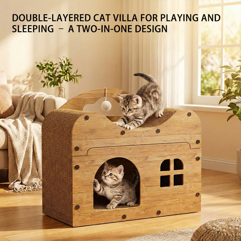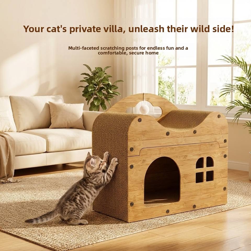 Maison pour chat en carton avec structure en bois, arbre à chat avec griffoir en carton ondulé pour jouer et se reposer en intérieur
