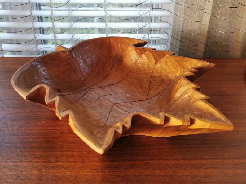 Grand bol en bois en forme de feuille d'érable, signé Gérard Fortin, vintage, grand, 18 pouces, pièce maîtresse, bol en bois d'érable sculpté à la main au Canada