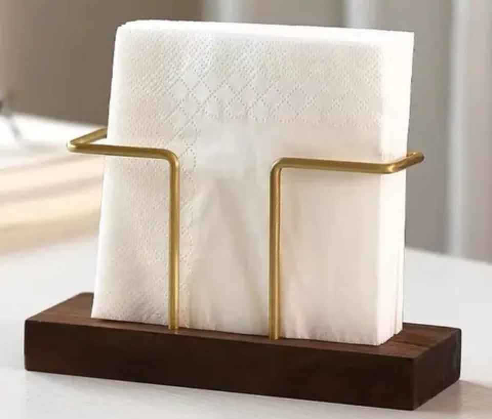 Porte-serviettes en bois avec base rectangulaire, deux supports métalliques dorés, pour serviettes blanches verticales, organisateur de table minimaliste