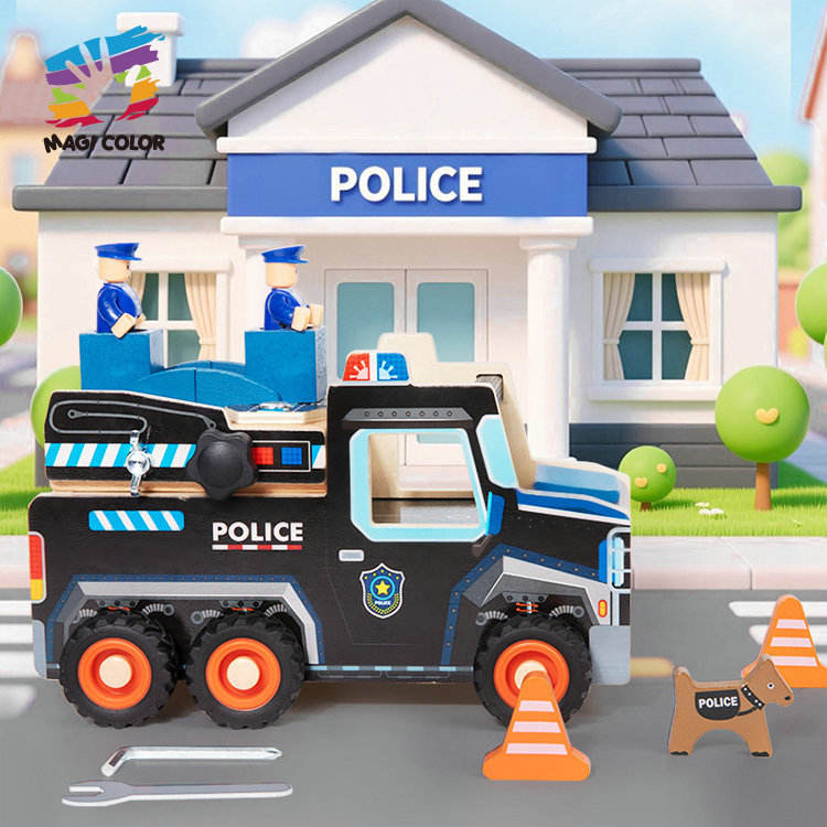 Ensemble de jouets de construction en bois de voiture de police avec écrous et boulons, démontage et assemblage, comprend des policiers, un chien, des cônes de signalisation W04A684