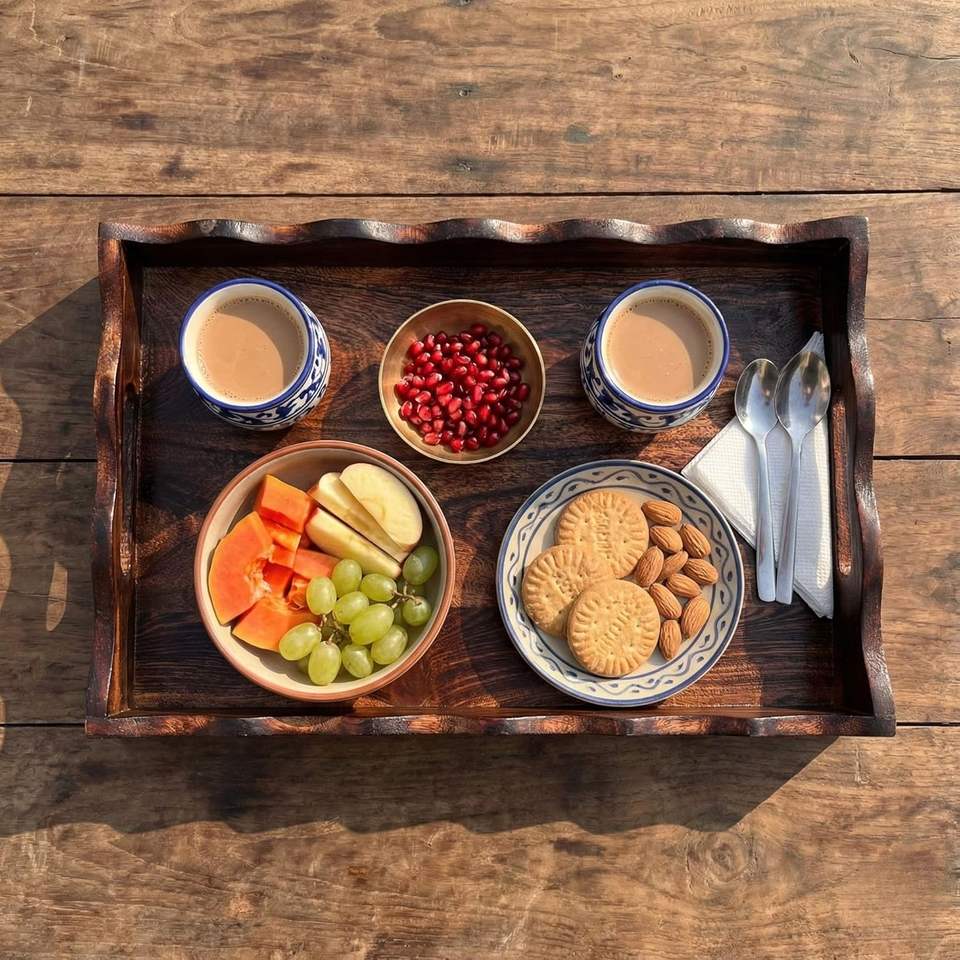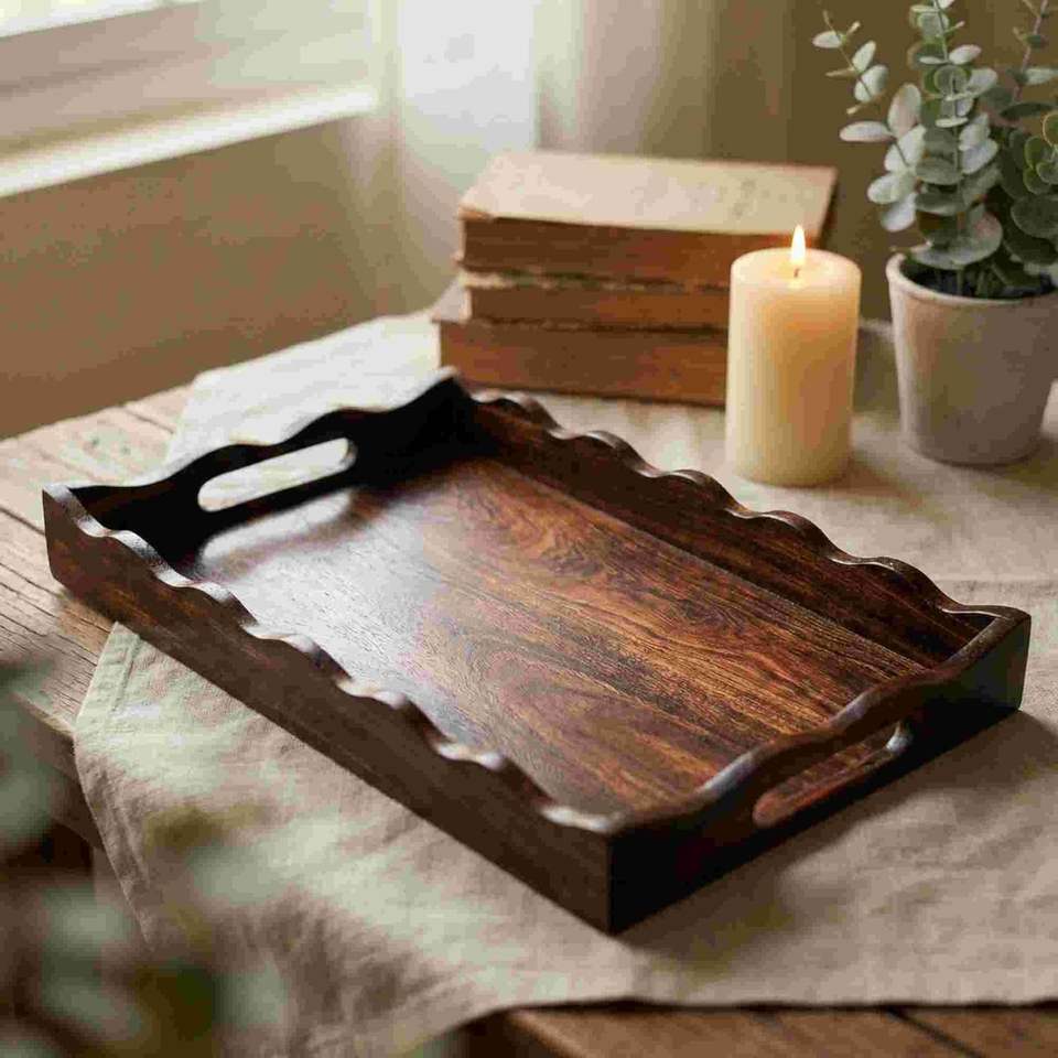 Plateau de service rectangulaire en bois pour la maison et la cuisine, finition mangue, plateau pour le petit-déjeuner, le thé et les collations avec poignées pour la table à manger