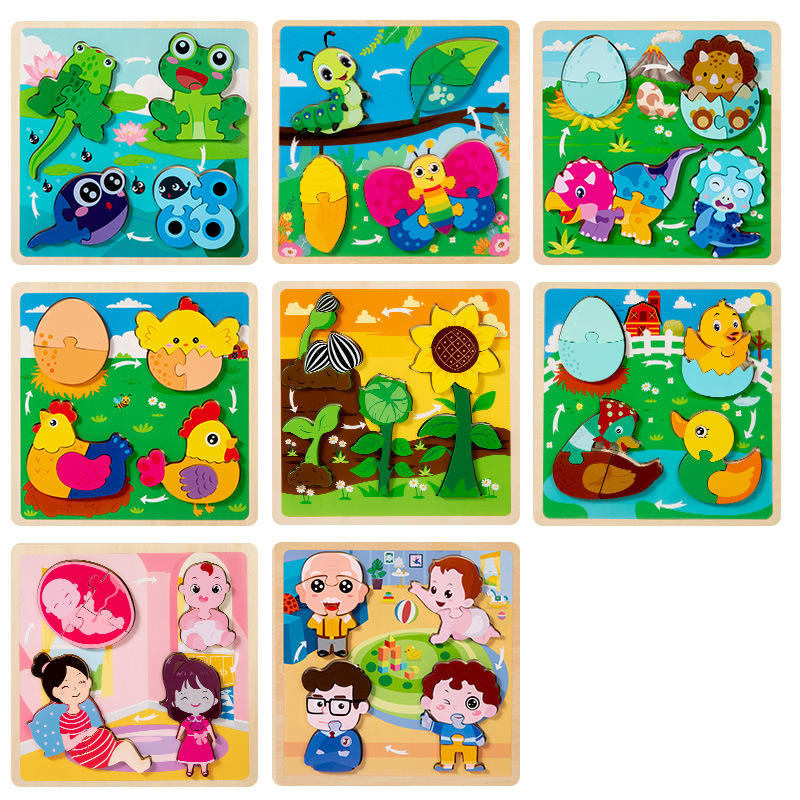 Puzzle en bois en trois dimensions, personnages de dessins animés d'animaux et de plantes, cycle de croissance, évolution, blocs de construction en forme de puzzle, correspondance