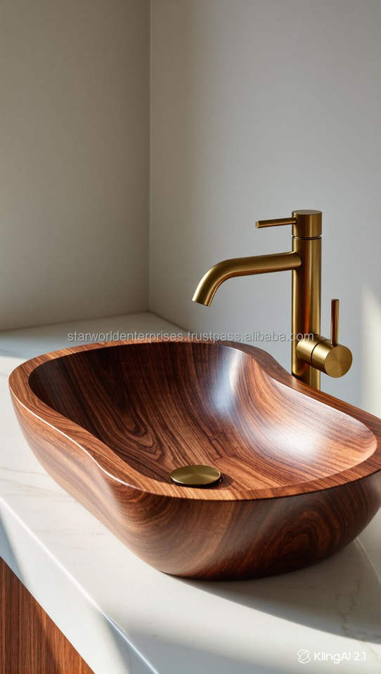Wooden Wash Basin Antique Wooden Bowl Modern Luxury Design Oval Art Washbasin Hotel Hand Wash Basin White and Gold Bathroom