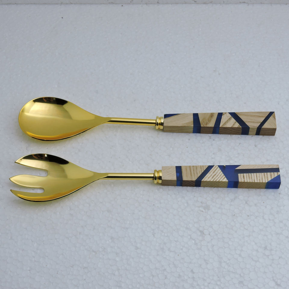 Poignée en bois avec anneau en métal mince autour d'elle et en acier inoxydable avec serveur de salade de placage de cuivre