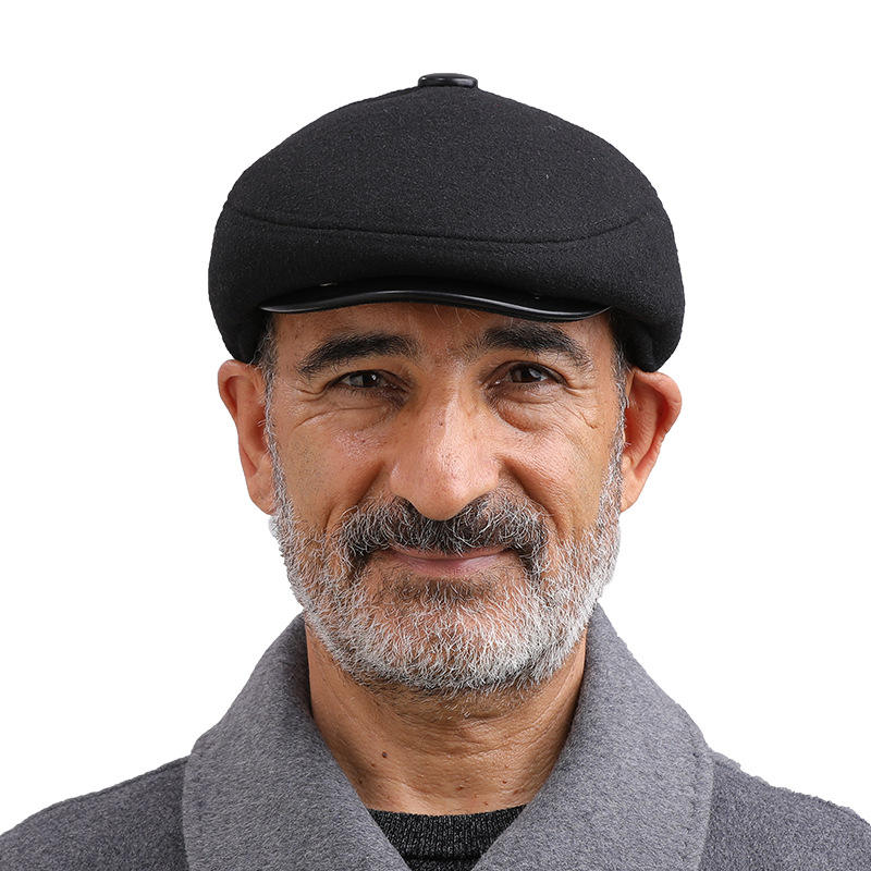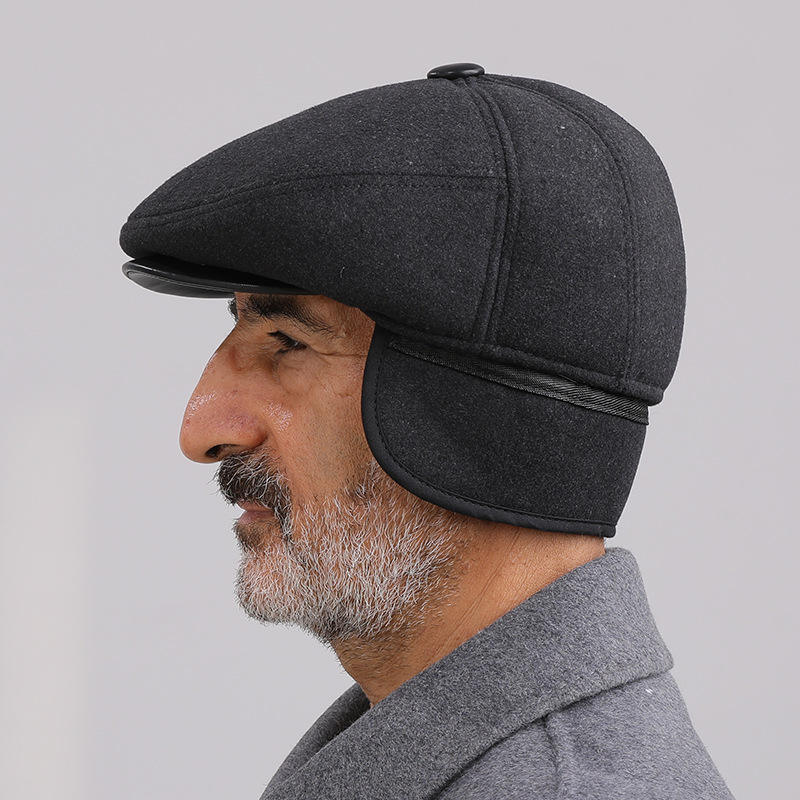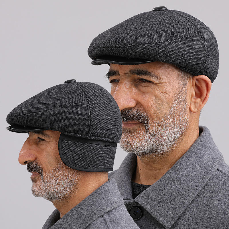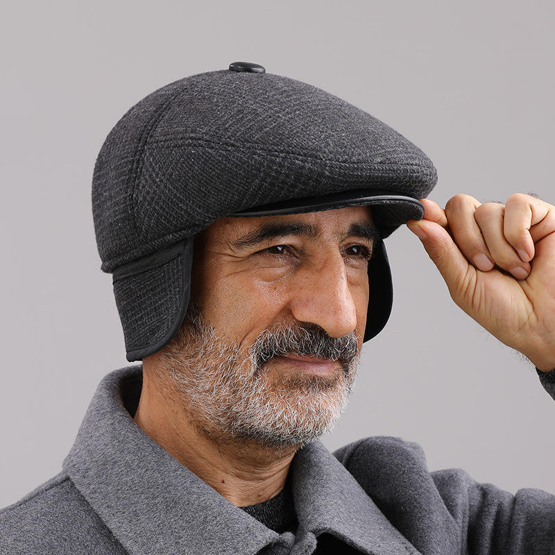 Casquette en laine pour hommes, casquette plate d'hiver avec rabats pour les oreilles, doublure en polaire, motif à carreaux gris et noir, pour hommes d'âge moyen et âgés