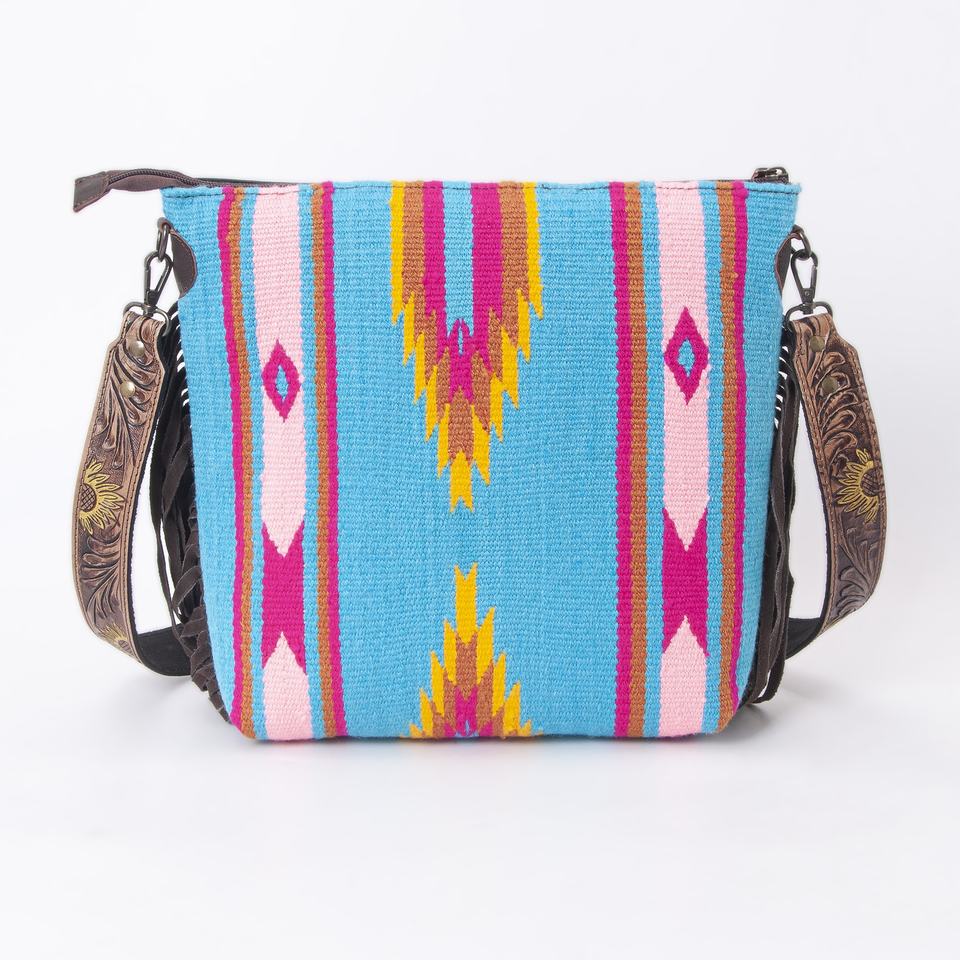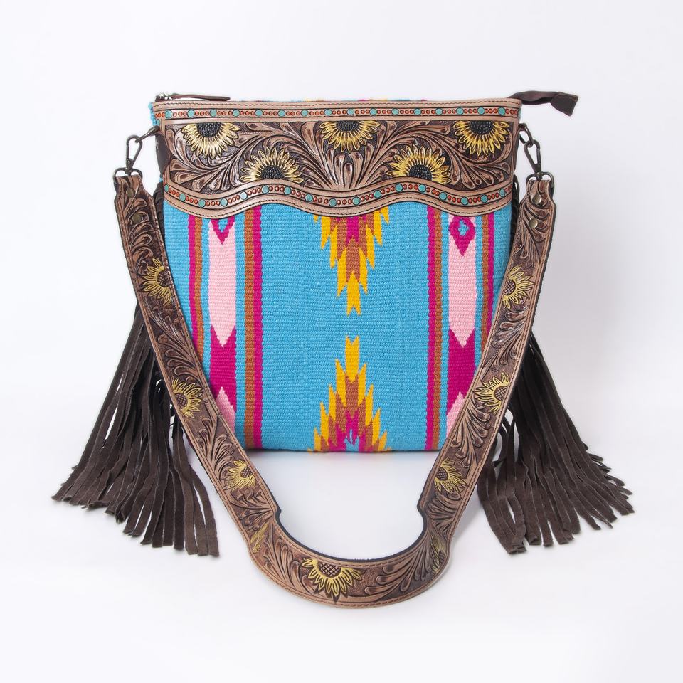 Sac à main en cuir repoussé à la main avec sangle en cuir, style couverture de selle Western en laine