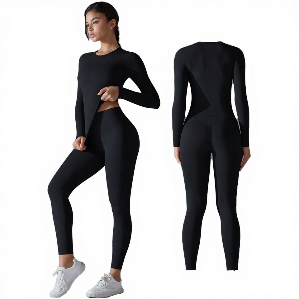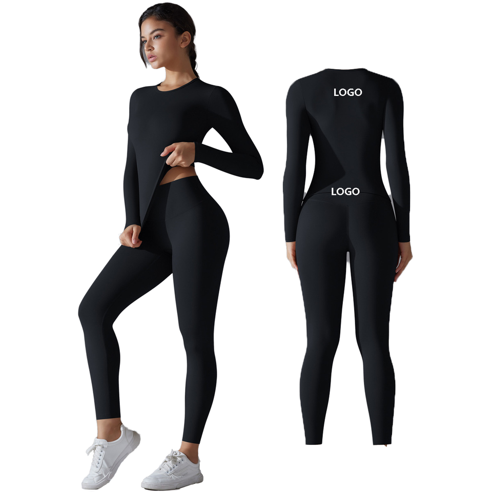 Ensembles d'entraînement 2 pièces, haut court à manches longues et col rond uni, respirant et sans coutures, et leggings taille haute froncés, tenues de sport et de yoga