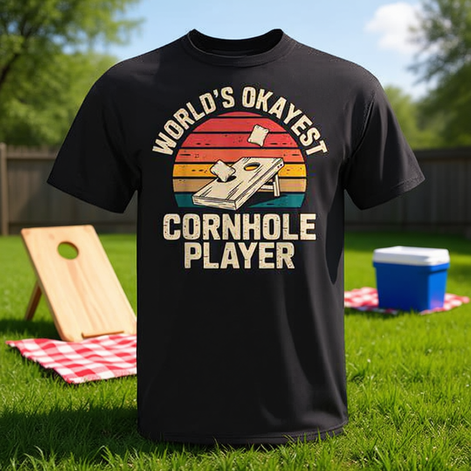 T-shirt unisexe à manches courtes et col rond pour adulte, avec impression sérigraphiée, design rétro, « Worlds Okayest Cornhole Player »