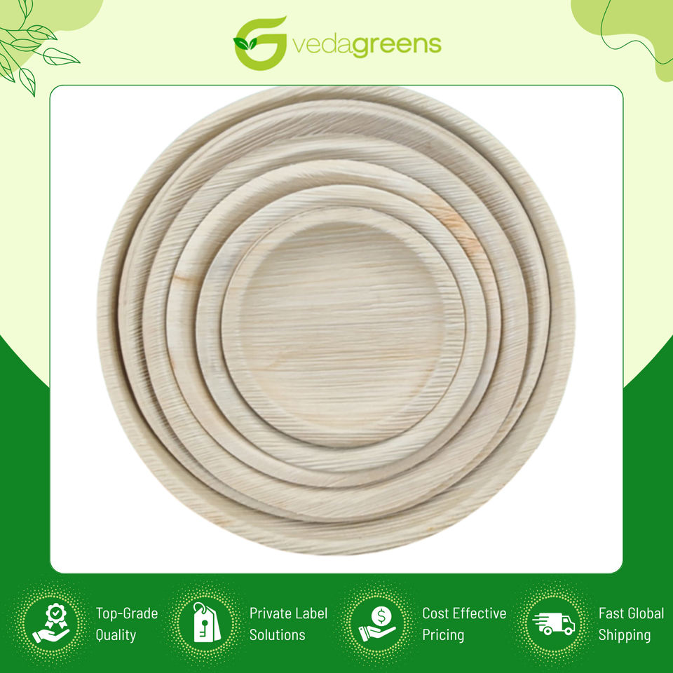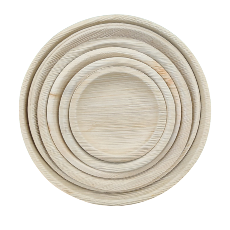 Exportateur mondial vendant des assiettes rondes jetables en feuilles de palmier d'arec pour cadeaux d'affaires, camping et articles promotionnels à bon prix