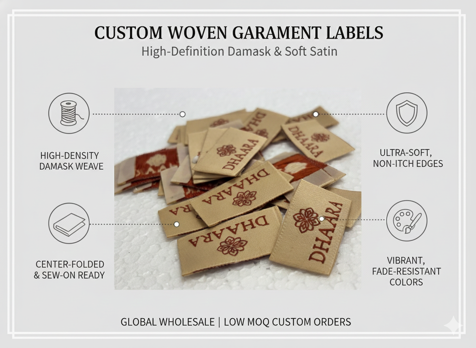 Étiquettes principales de vêtements en satin doux écologique imprimé damassé haute définition, étiquettes de col, étiquettes de logo de marque de vêtements