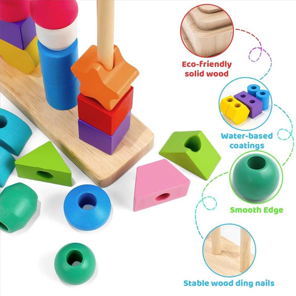 Wudly 5-Pillar Sorter Lacing Beads Colorful Wooden Montessori Bead Toy Set Educational Threading Toys for 3+ Years Kids Child